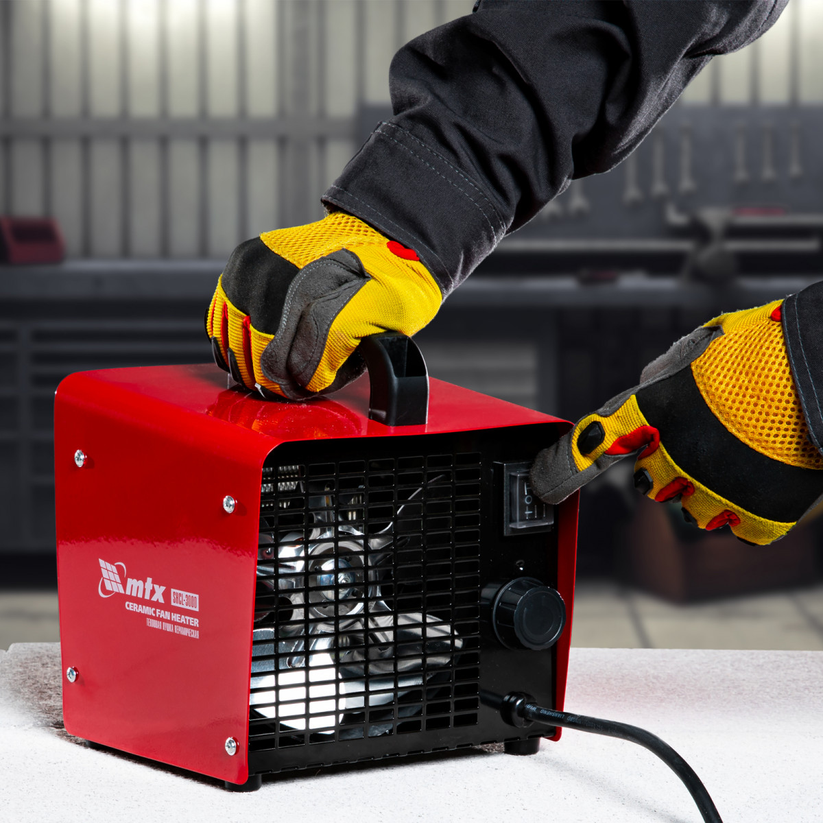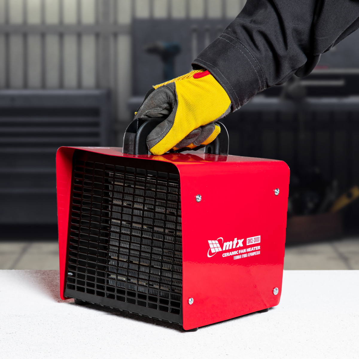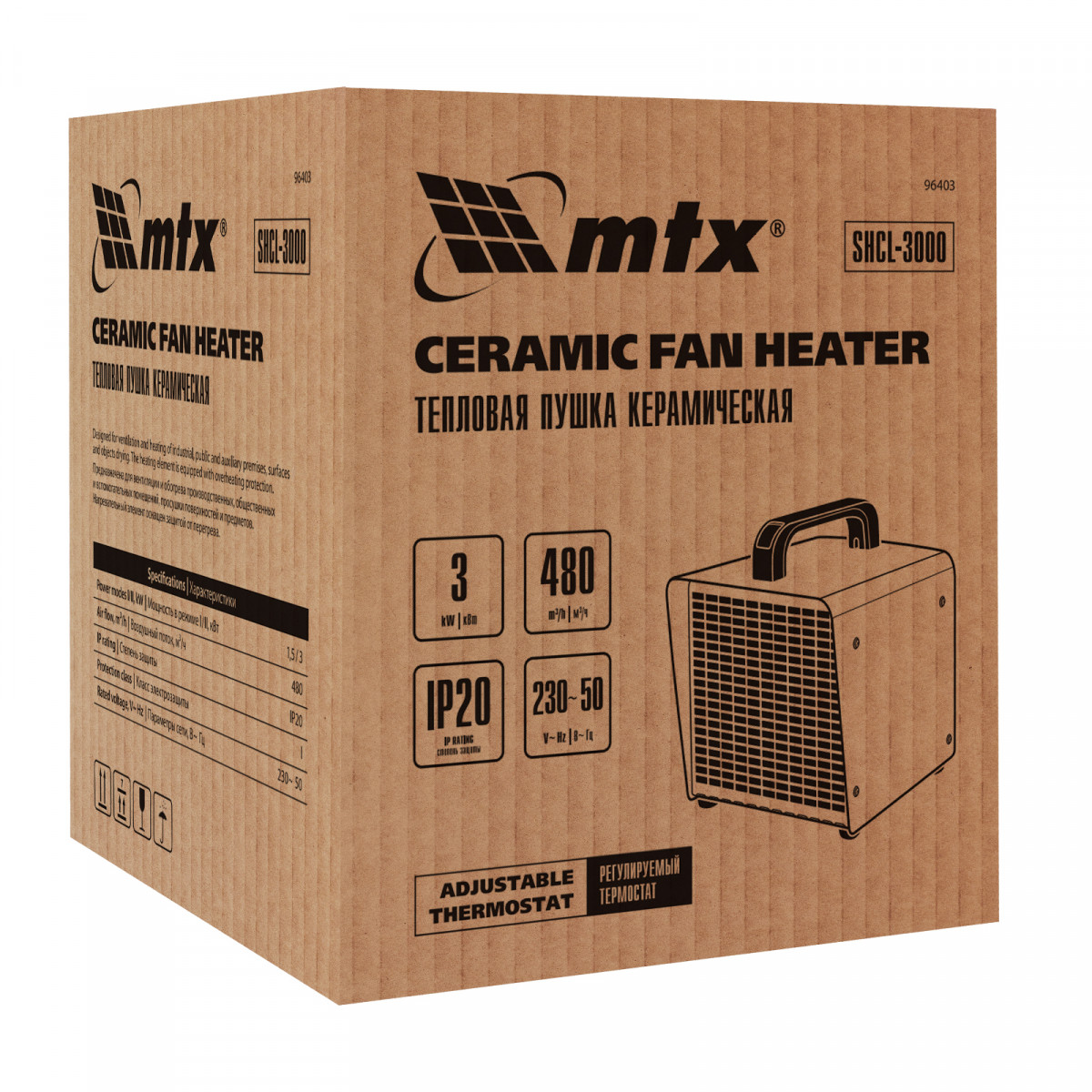 Керамическая тепловая пушка MTX SHCL-3000 96403 производительностью 480 куб. м/ч, в квадратном корпусе, работает в режиме нагрева на полной мощности 3 кВт или частичной 1,5 кВт, а также в режиме вентиляции. Предназначена для обогрева цехов, складов, мастерских и других нежилых помещений площадью до 40 кв. м. Также позволяет быстро просушивать различные поверхности, например, стяжки пола или оштукатуренные стены.,Отличительная черта пушки — технология PTC. Металлокерамические нагревательные элементы обладают функцией саморегуляции электрического сопротивления, что обеспечивает оптимальную температуру нагревательного элемента и пожаро-, взрывобезопасность изделия. При сохранении физической целостности нагревательный элемент не теряет своих свойств на протяжении всего срока службы.