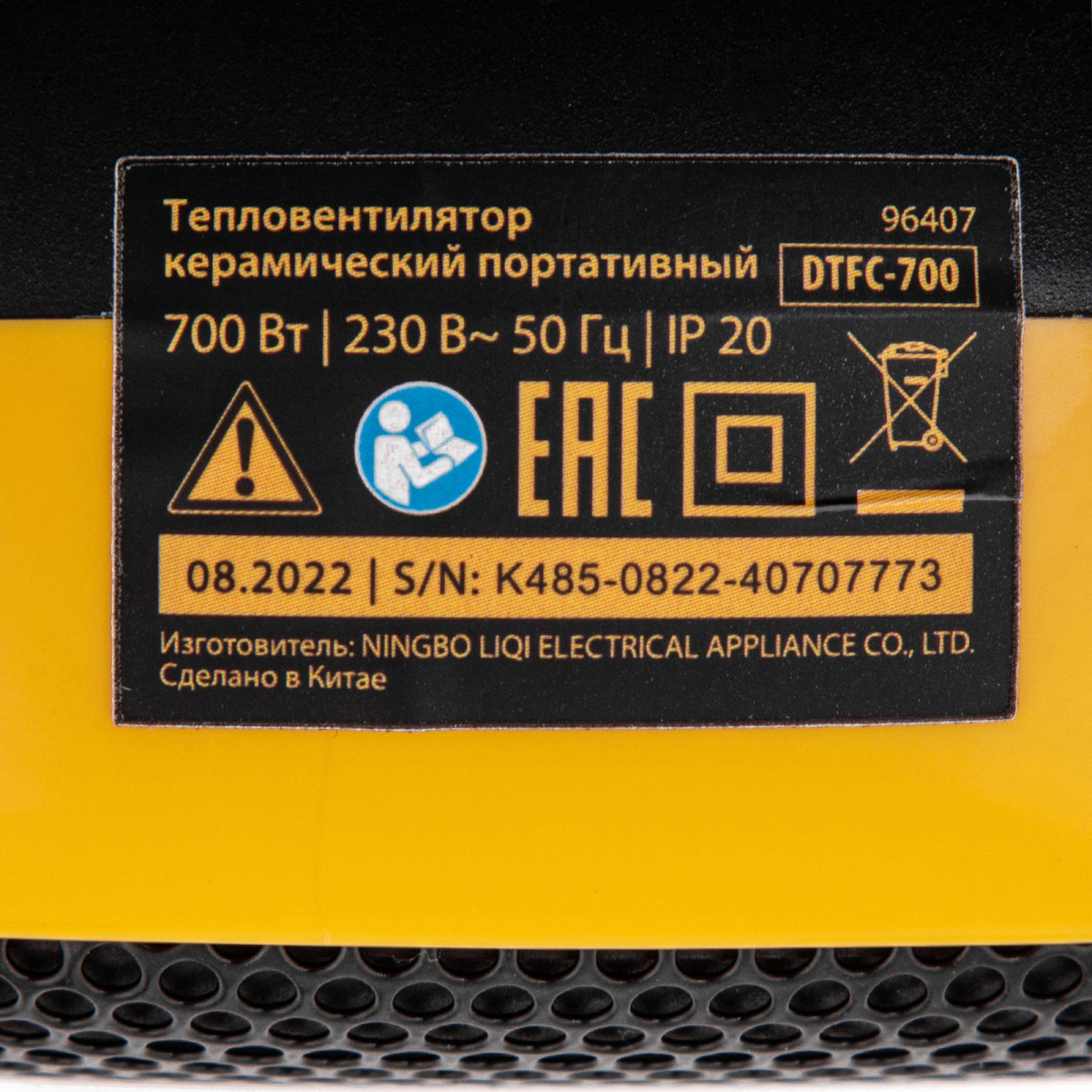 Портативный керамический тепловентилятор Denzel DTFC-700 96407 номинальной мощностью 700 Вт может работать в одном из двух режимов: нагрев с максимальной либо пониженной скоростью вентилятора (тихий режим). Используется в помещениях площадью до 10 кв. м., а также подходит для локального обогрева — например, рабочего места. Прост в эксплуатации и не требует технического обслуживания. Благодаря керамическому нагревательному элементу тепловентилятор не сушит воздух и не сжигает пыль, поэтому комфортен в использовании.