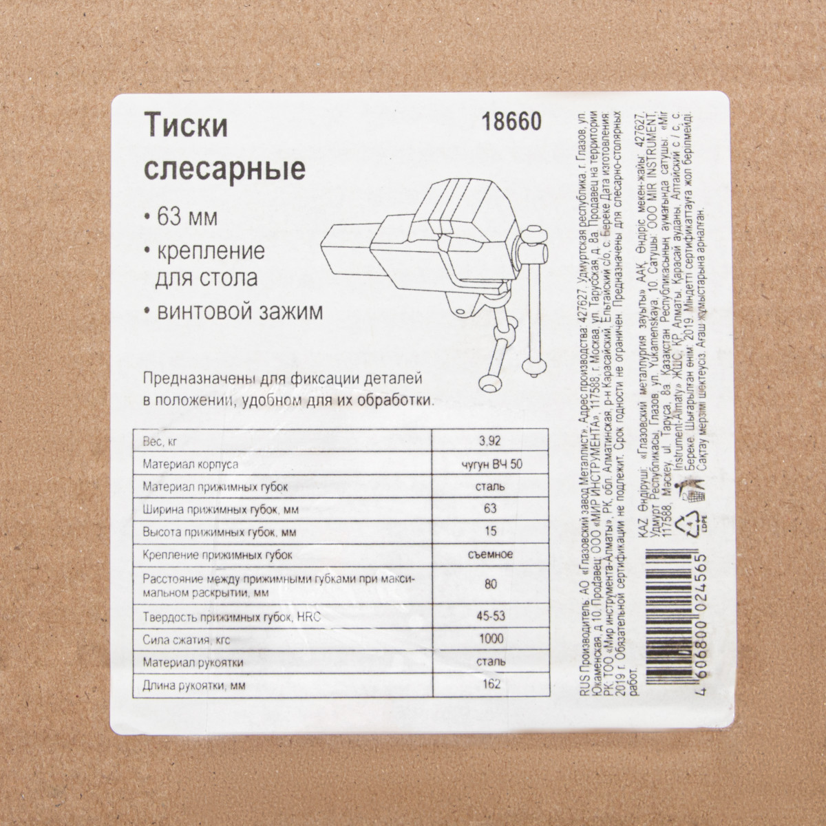 Тиски слесарные, 63 мм, крепление для стола, винтовой зажим (Глазов)
