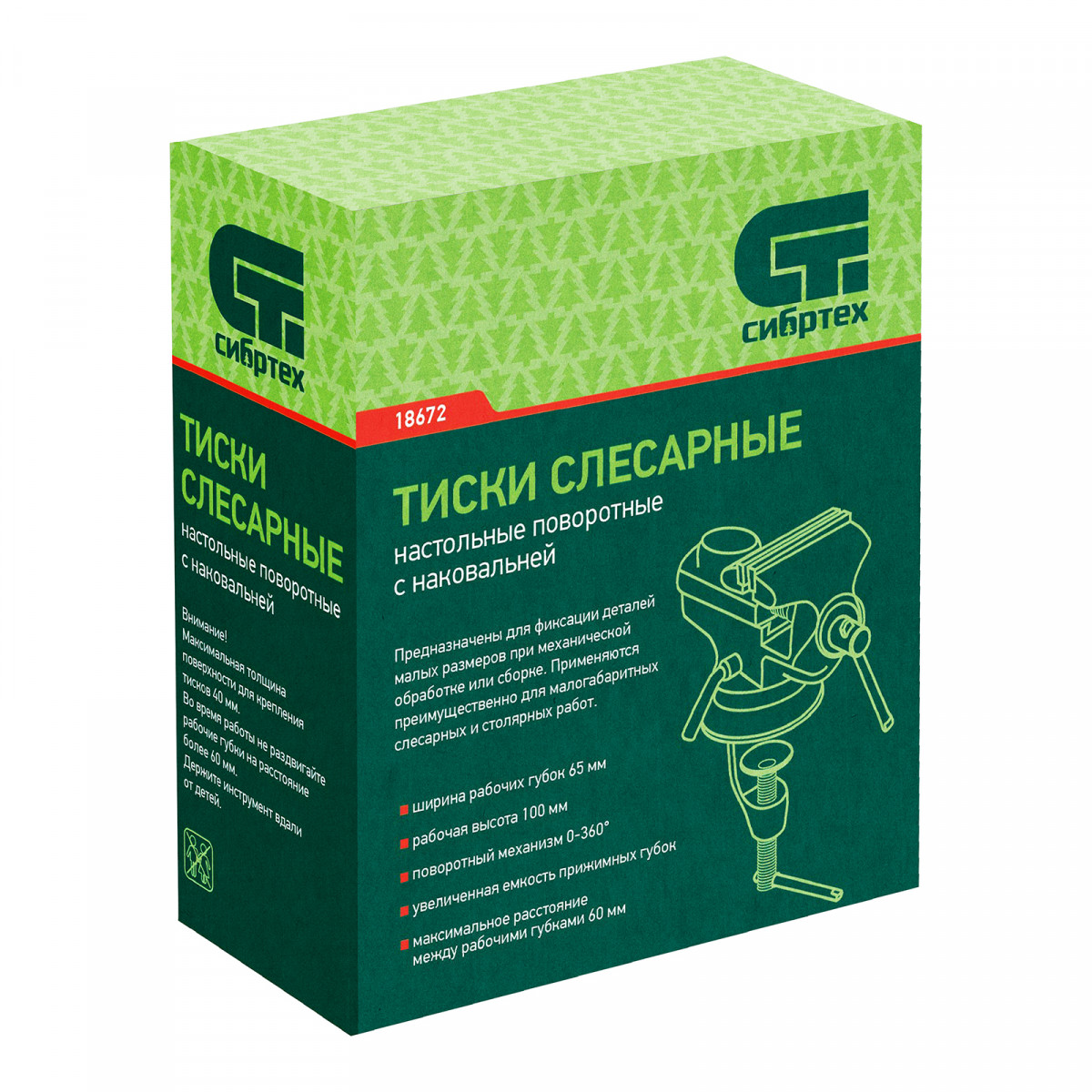 Настольные слесарные тиски Сибртех 18672, поворотные, с шириной рабочих губок 65 мм, с наковальней, пригодятся для фиксации заготовок до 55 мм. Благодаря им удобно обрабатывать негабаритные детали. Инструмент пригодится для проведения полупрофессиональных слесарных и столярных работ.