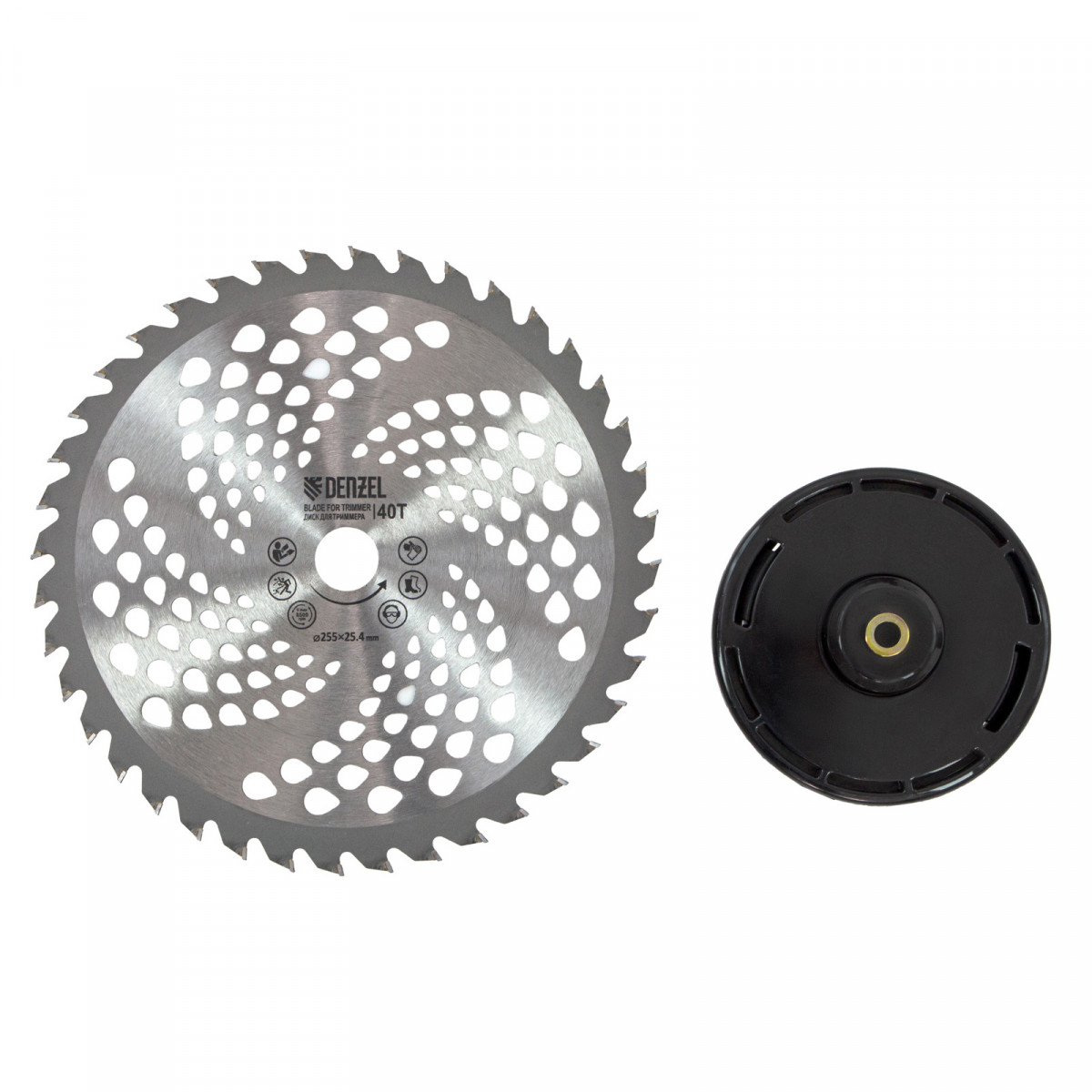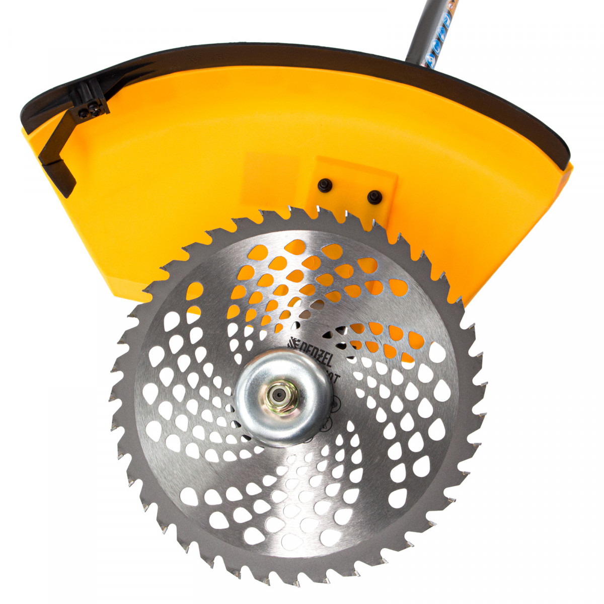• Дополнительные возможности — можно приобрести и установить на триммер диски Denzel 96323, 96325 для быстрого удаления растительности с жесткими стеблями (полыни, крапивы, лебеды), 96328 для скашивания молодых побегов кустарника диаметром до 3 мм.