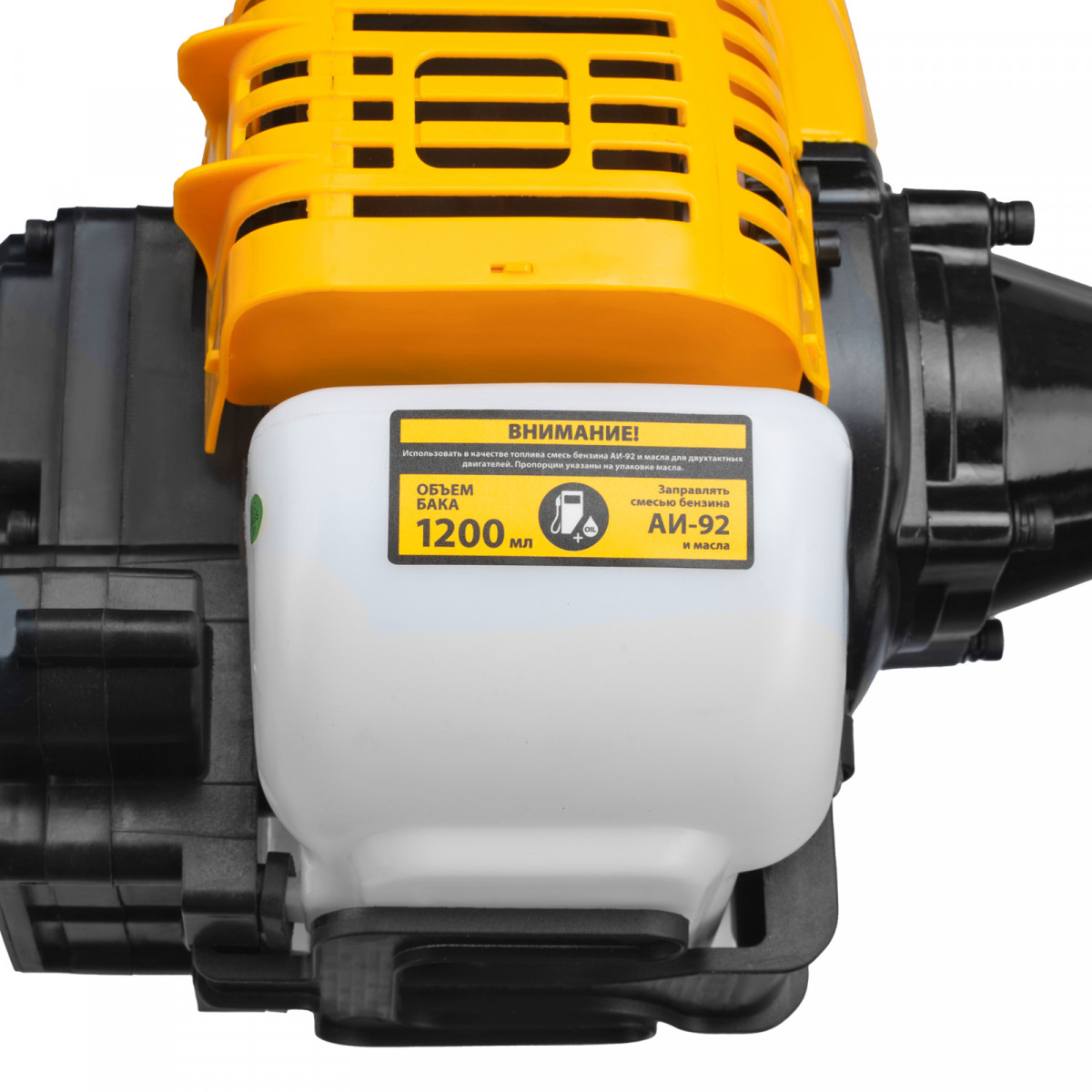 Бензиновый триммер Denzel DT-43E 962015 с двигателем объемом 43 куб. см, с неразъемной штангой и электростартером, поставляется комплектом из 2 частей и используется для ухода за дачным участком. С его помощью можно подравнять газон, скосить траву любого типа, в том числе с жесткими древовидными стеблями (полынь, крапива, лебеда, борщевик), а также срезать кустарник и молодые побеги деревьев с диаметром стволов до 10 мм. Триммер успешно справляется с этими задачами благодаря входящим в комплект катушке с леской и пильному диску с шириной скашивания 42 и 25,5 см соответственно. На штангу уже установлен редуктор и корпус сцепления, что упрощает подготовку инструмента к работе.