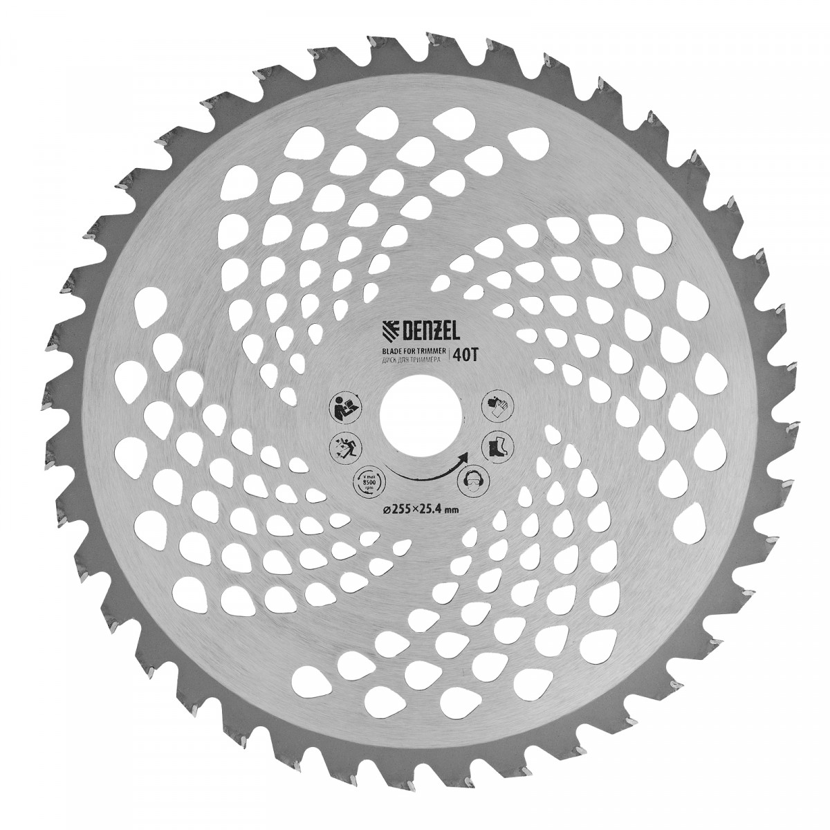 • Дополнительные возможности — можно приобрести и установить на триммер диски Denzel 96323, 96325 для быстрого удаления растительности с жесткими стеблями (полыни, крапивы, лебеды) или 96328 для скашивания молодых побегов кустарника диаметром до 3 мм.