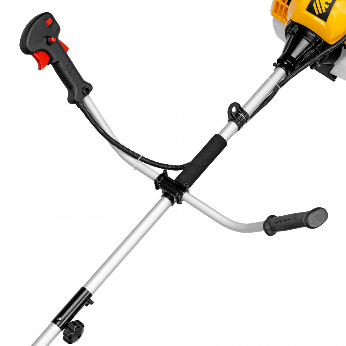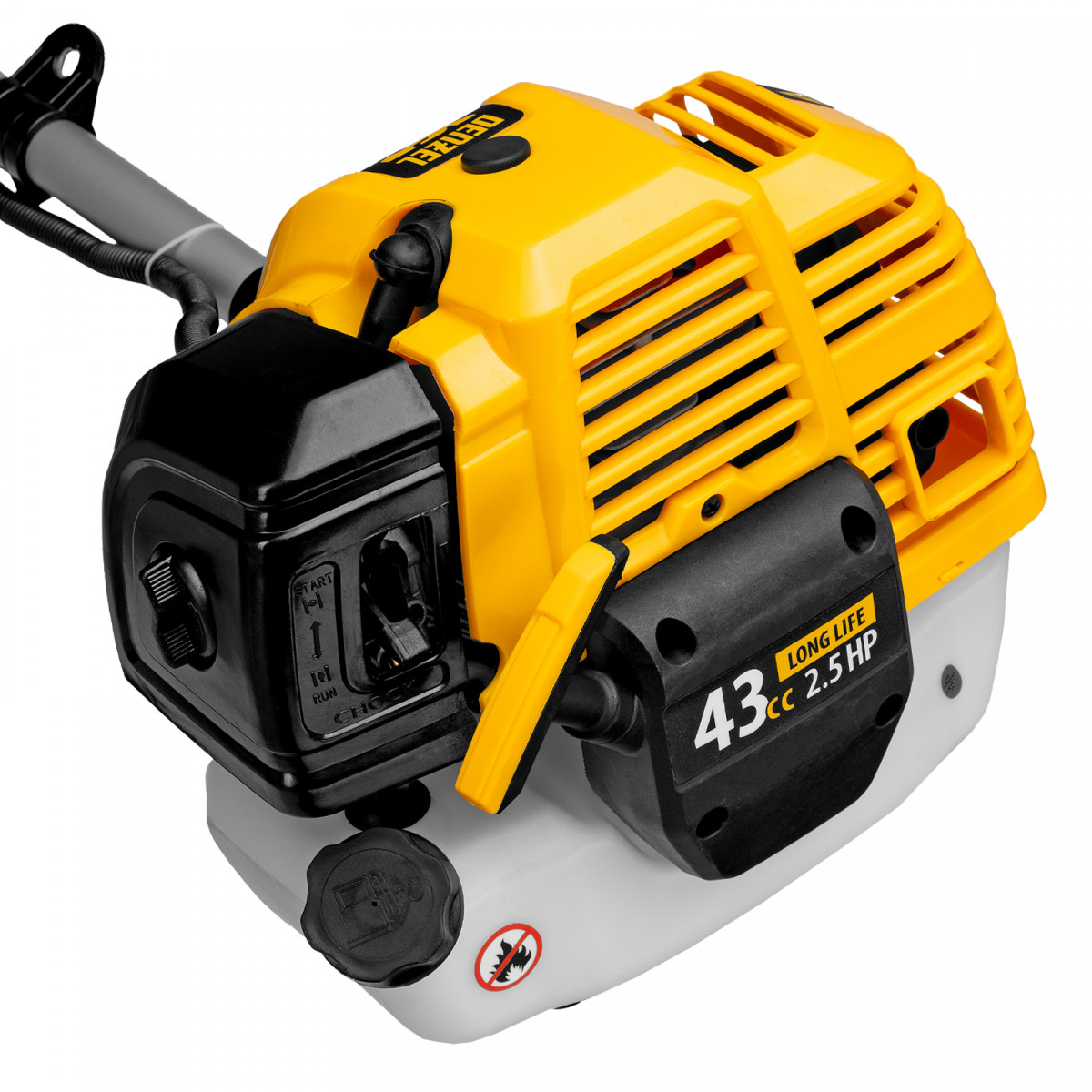 Бензиновый триммер Denzel DT-43S 96225 с двигателем объемом 43 см3 и мощностью 2,5 л.с., с разъемной штангой, состоит из 2 частей. Используется для подравнивания газона, скашивания травы всех типов, в том числе с жесткими древовидными стеблями (полыни, крапивы, лебеды, борщевика), а также срезания кустарника и молодых побегов деревьев с диаметром стволов до 10 мм. Это оптимальный вариант для работы в труднодоступных местах: вокруг насаждений, вдоль садовых дорожек, возле стен дома и т. д.,Мощный двухтактный двигатель обеспечивает высокую частоту вращения оснастки — 9500 об/мин. Ширина скашивания диском составляет 25,5 см, леской — 42 см. Поэтому можно обработать большой участок за короткое время.