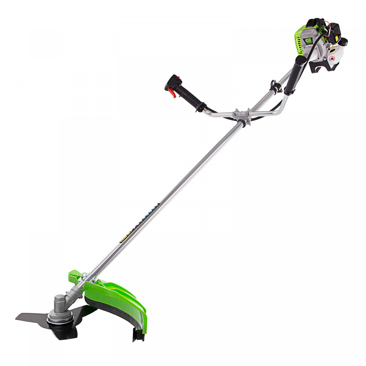 - Комфорт во время работы — ручки велосипедного типа обеспечивают оптимальное положение рук, а плечевой ремень равномерно распределяет вес инструмента, поэтому мотокосу удобно удерживать и направлять.