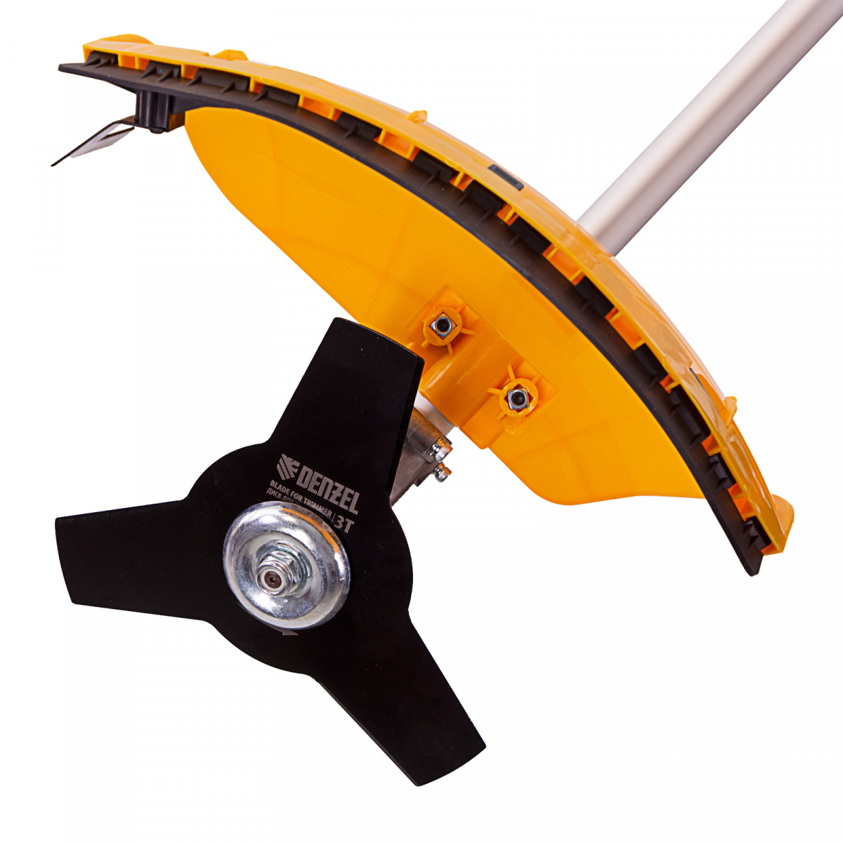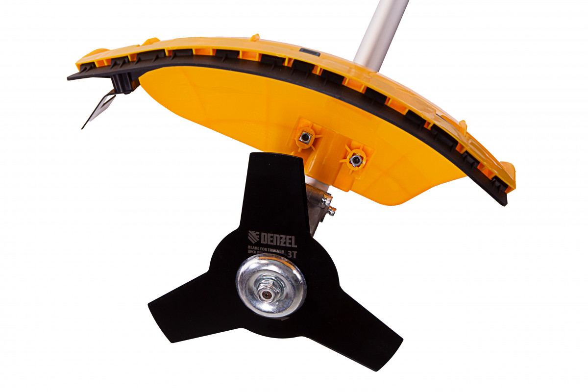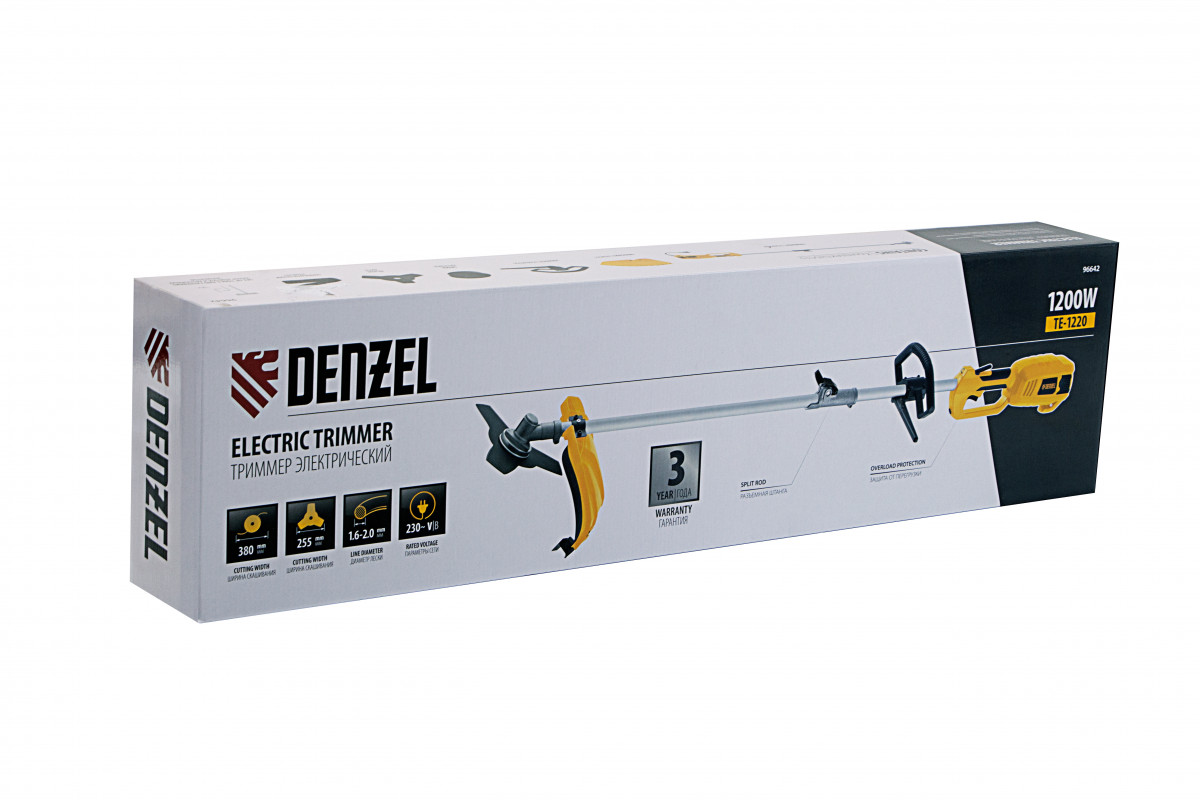 Электрический триммер Denzel TE-1220 96642 мощностью 1200 Вт, с разборной штангой, катушкой и диском, предназначен для скашивания травы различных типов, в том числе с жесткими стеблями: полыни, крапивы, лебеды. Мощный двигатель обеспечивает вращение катушки и диска со скоростью 7500 об/мин. Ширина скашивания за один проход составляет 38 см при использовании лески и 25,5 при использовании диска, что удобно для работы на небольших участках. Электродвигатель не требует приготовления топливной смеси и сложного технического обслуживания. Благодаря отсутствию вредных выбросов и неприятного запаха работа триммера не вредит здоровью и не вызывает дискомфорт.,Дополнительно к триммеру можно приобрести диск Denzel 96323 с шириной скашивания 230 мм для быстрого удаления растительности с жесткими стеблями, 96328 для скашивания молодых побегов кустарника диаметром до 3 мм, 96340 для срезания борщевика, кустарника и молодых побегов деревьев с диаметром стволов до 10 мм.