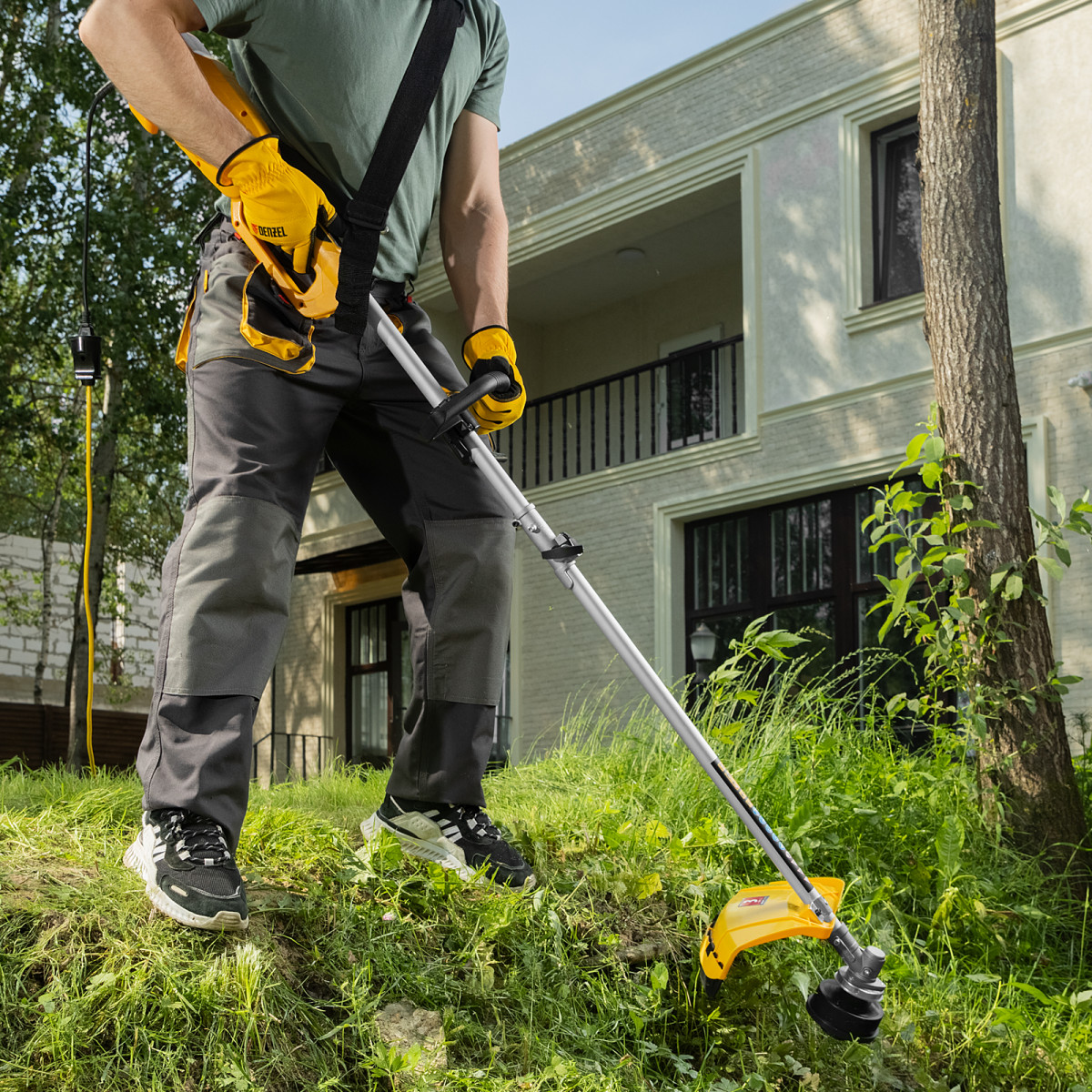 - Снижение нагрузки на спину — наплечный ремень равномерно распределяет вес садового электротриммера, что уменьшает усталость при длительной работе.