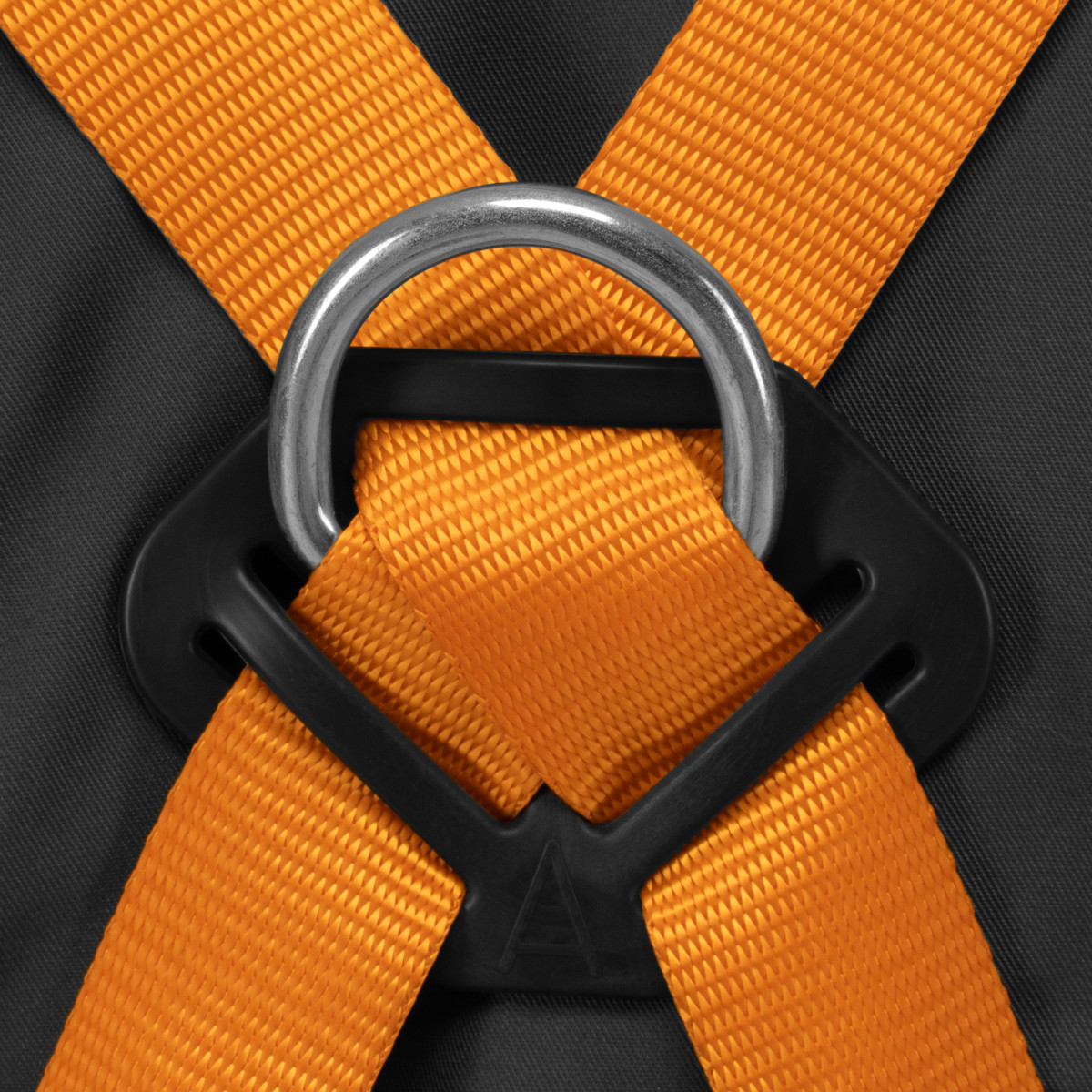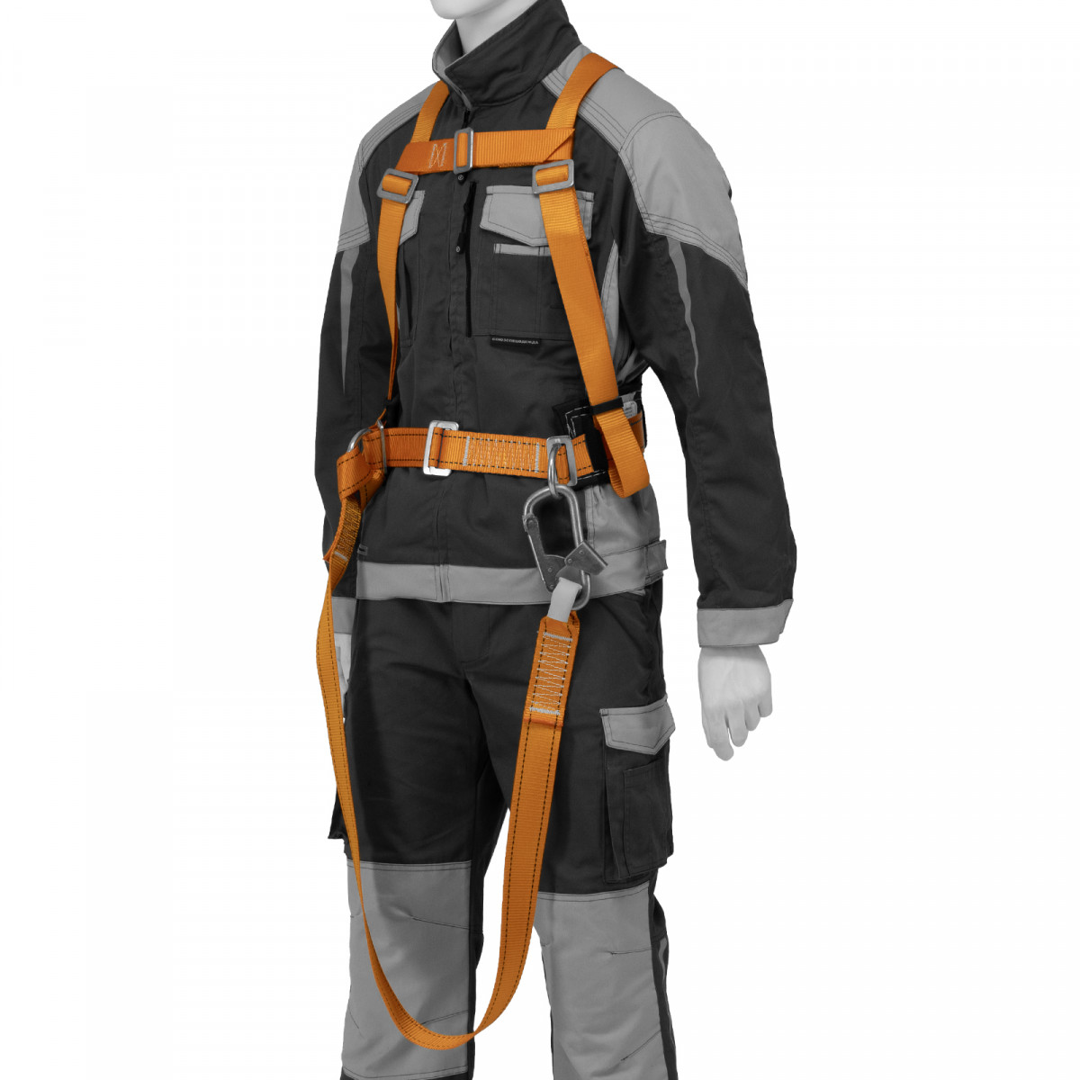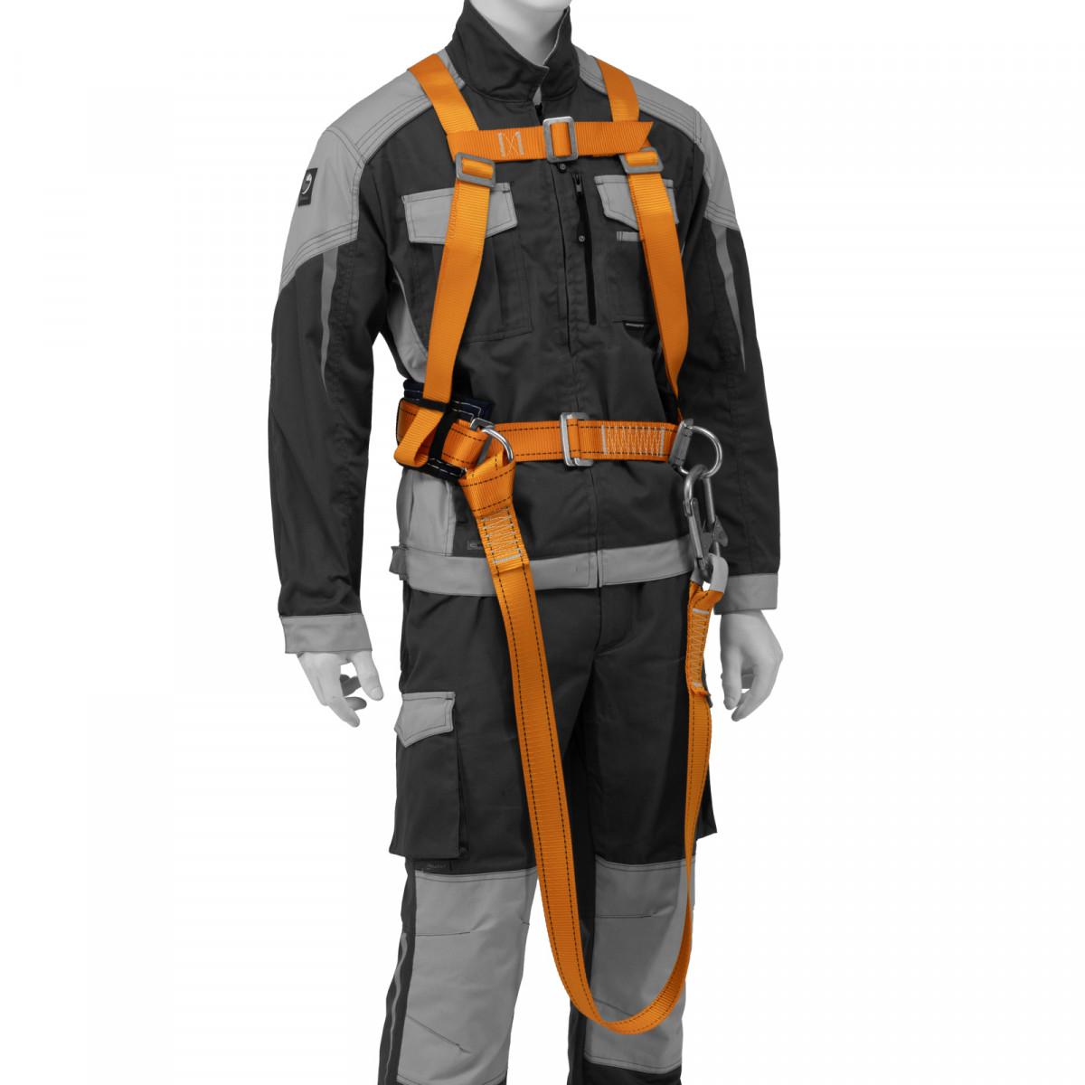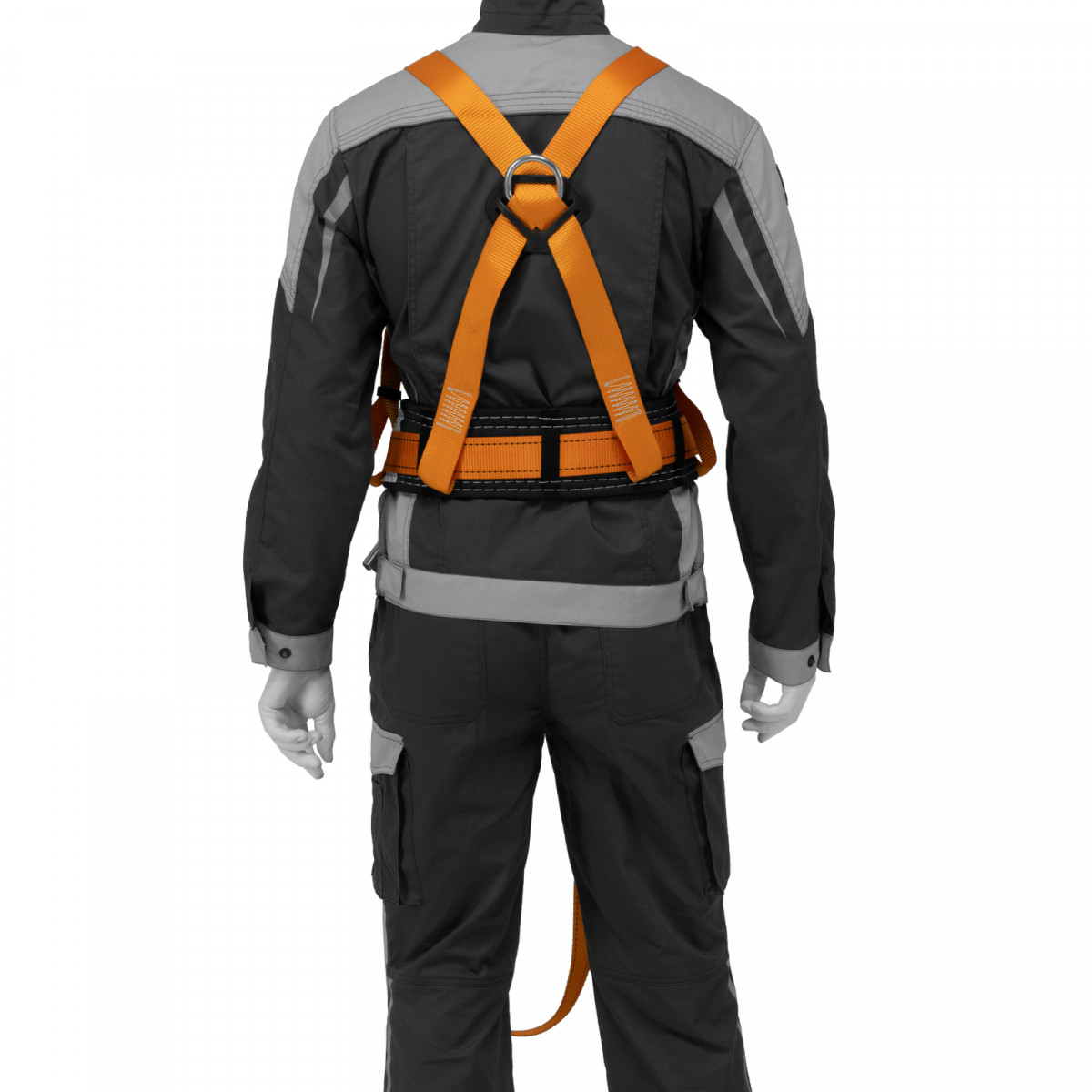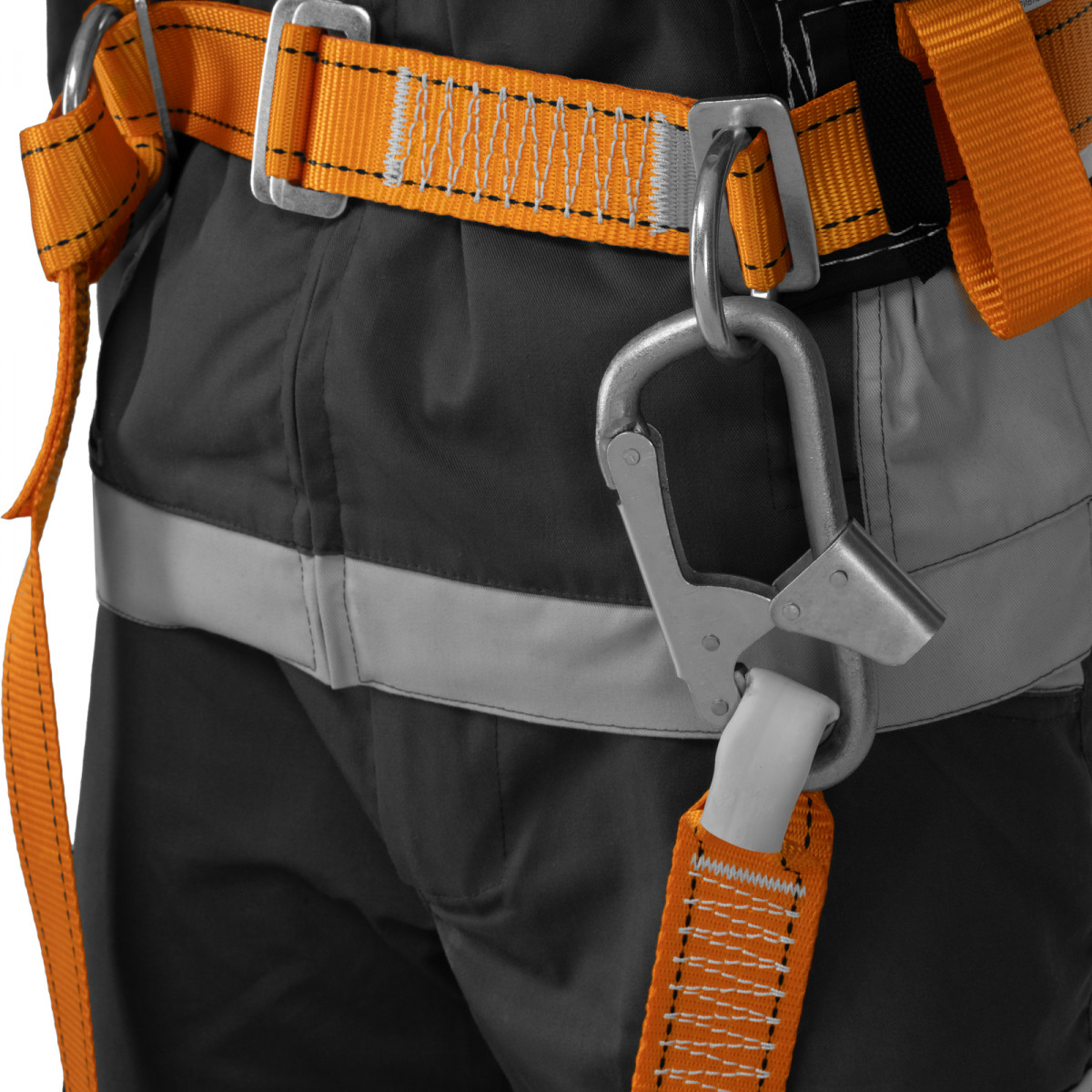 • Надежность — большой монтажный карабин, 2 металлических D-образных кольца на поясе и 1 на спине гарантированно удерживают пользователя.