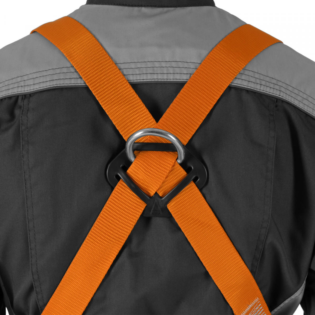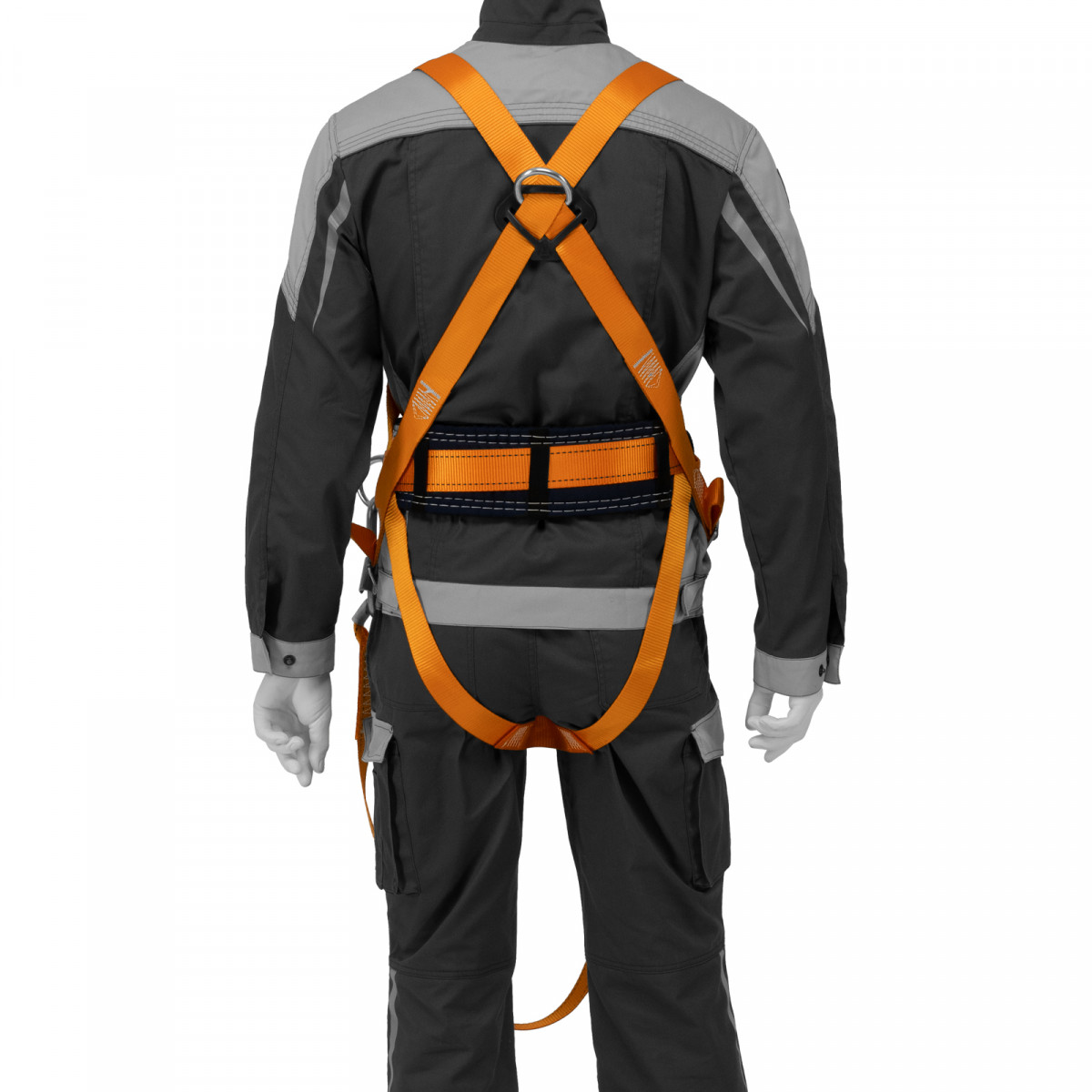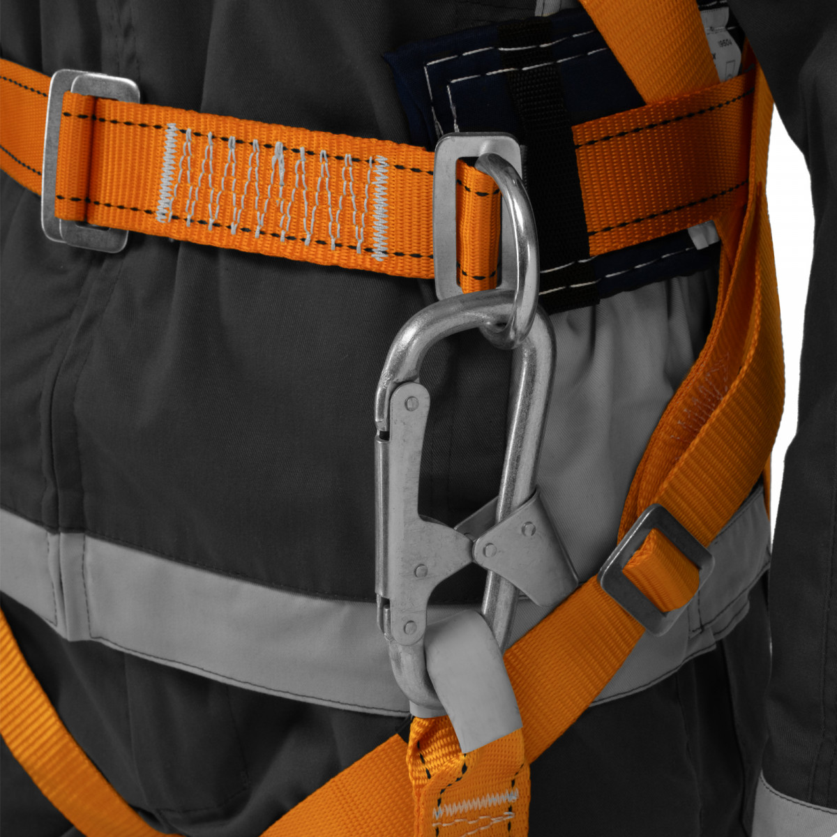 • Надежное крепление — привязь имеет 2 прочных D-кольца на поясном ремне и одно на спине, а также большой монтажный карабин.