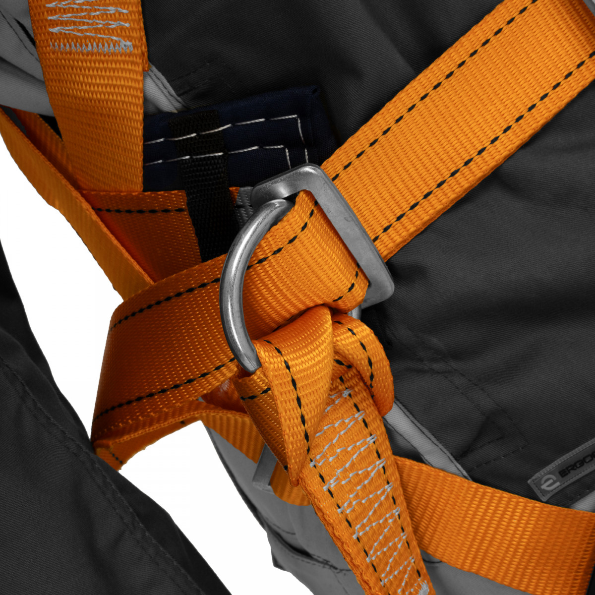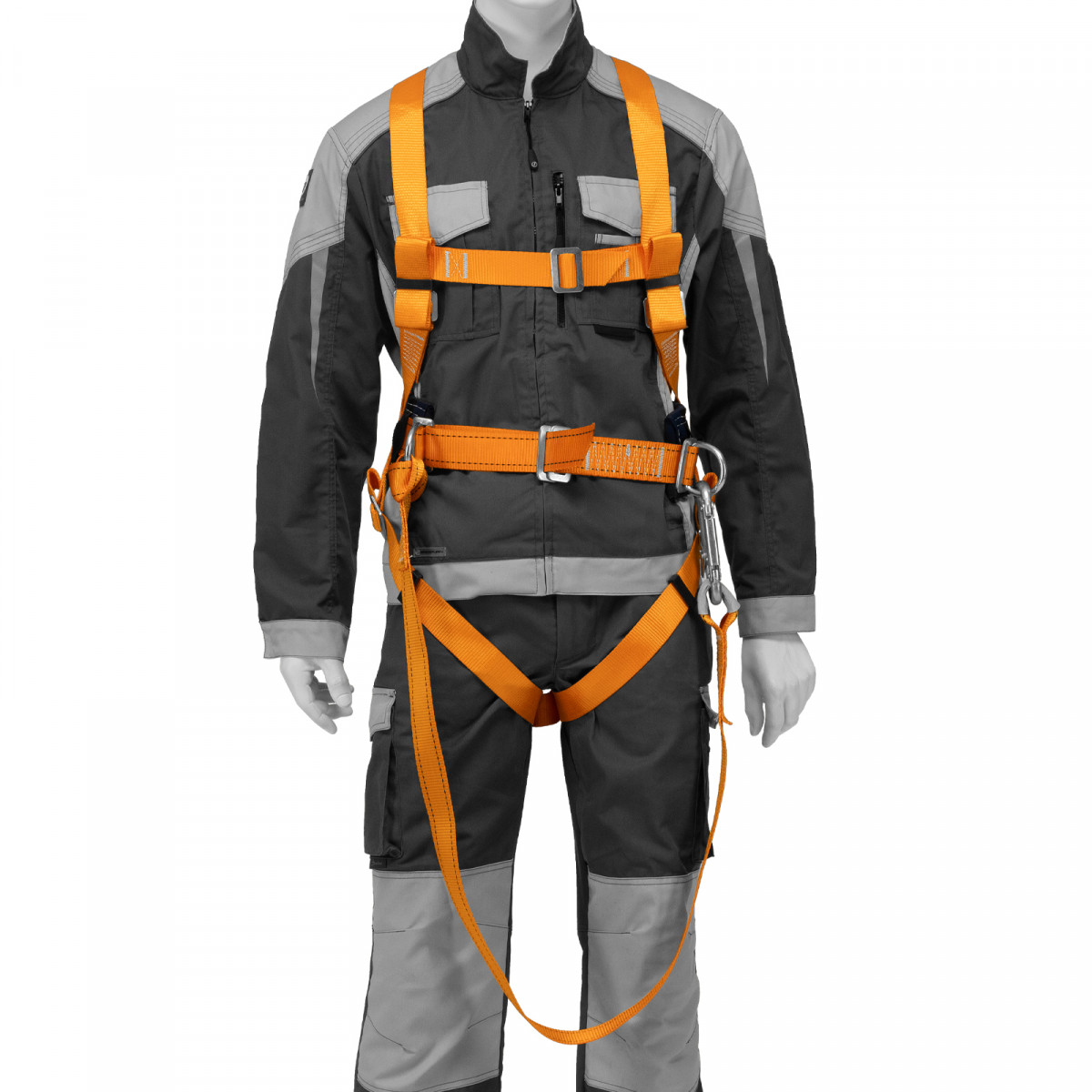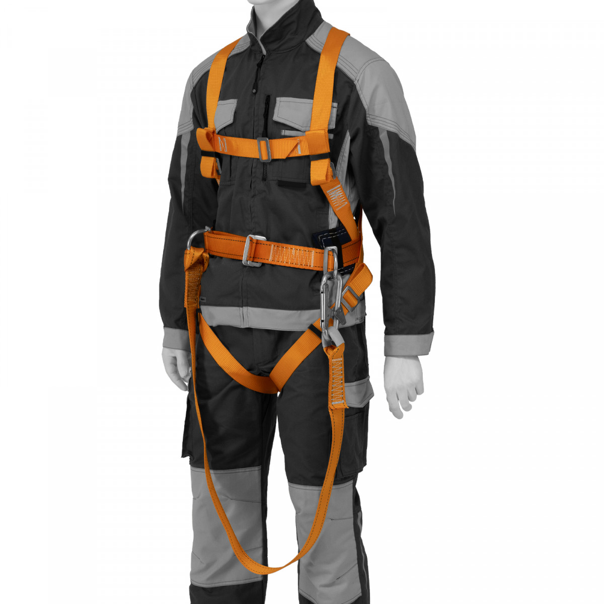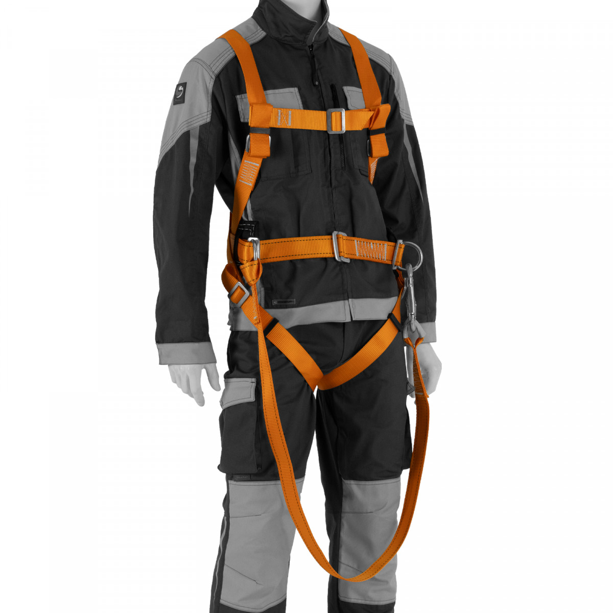 • Надежное крепление — привязь имеет 2 прочных D-кольца на поясном ремне и одно на спине, а также большой монтажный карабин.