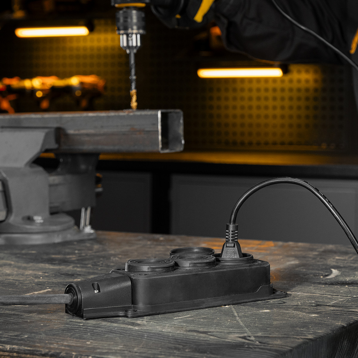 Удлинитель-шнур имеет степень защиты IP 44, что позволяет использовать его даже во время выпадения осадков.