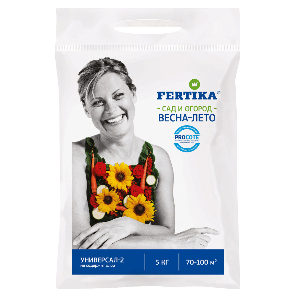 Фертика Универсал-2 - является долгоиграющим универсальным удобрением, рекомендуется для всех садовых культур и овощей. Состав 12 аммиачная селитра : 8 суперфосфат : 14 хлористый калий. Не содержит хлор. Не подкисляет почву. Удобрение универсально тем, что применяется с февраля по март для выращивания рассады, с апреля по май для посева семян и высадки рассады, с июня по август для подкормки растений в период роста, корни и стебли растений быстро восстанавливаются и набирают свою силу. Все это происходит благодаря идеально сбалансированным питательным элементам, что позволяет добиться высокого урожая.