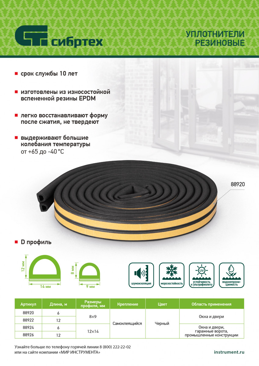Уплотнитель резиновый 14х12 мм для широких щелей, 6 м, профиль "D", черный Сибртех
