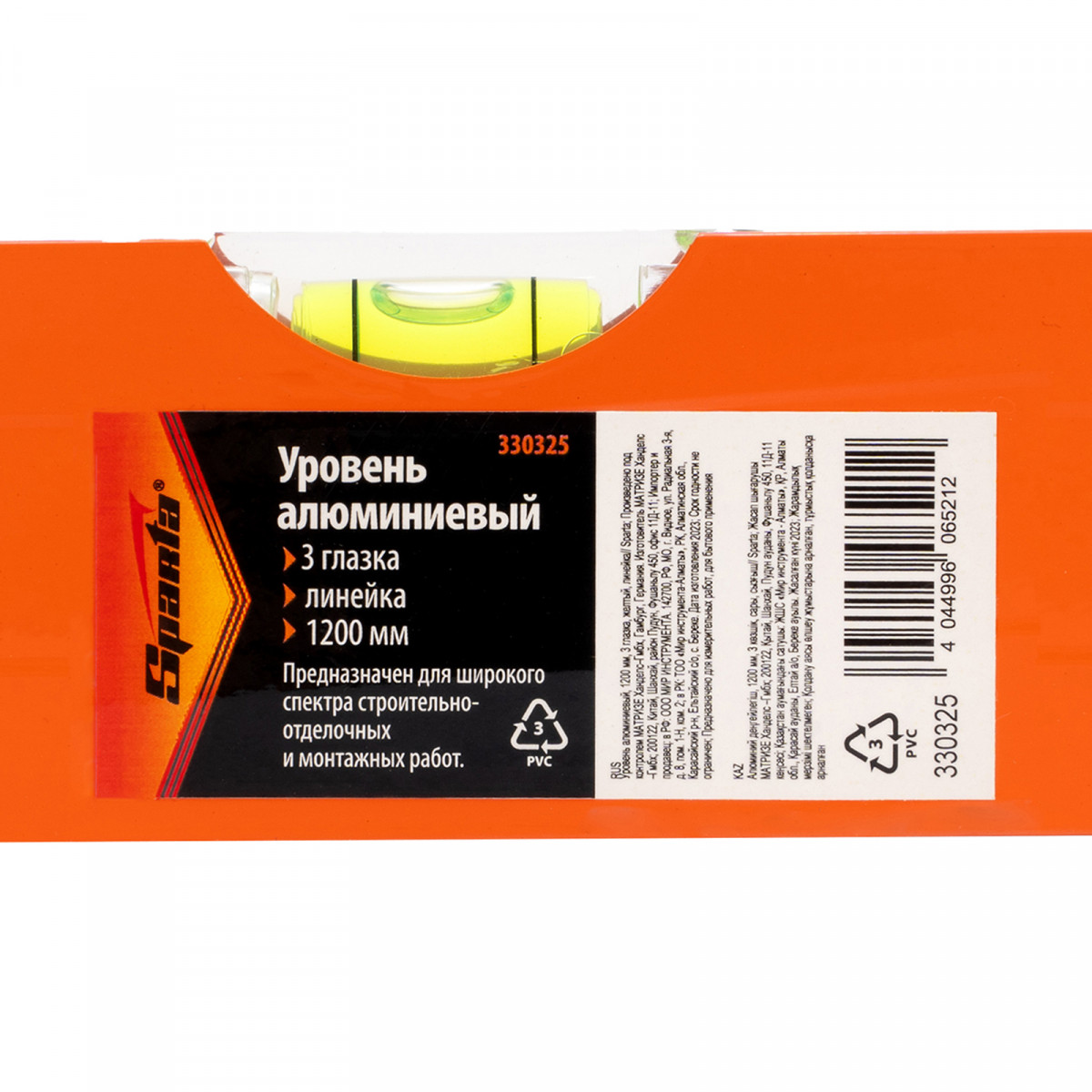Уровень алюминиевый, 1200 мм, 3 глазка, желтый, линейка Sparta