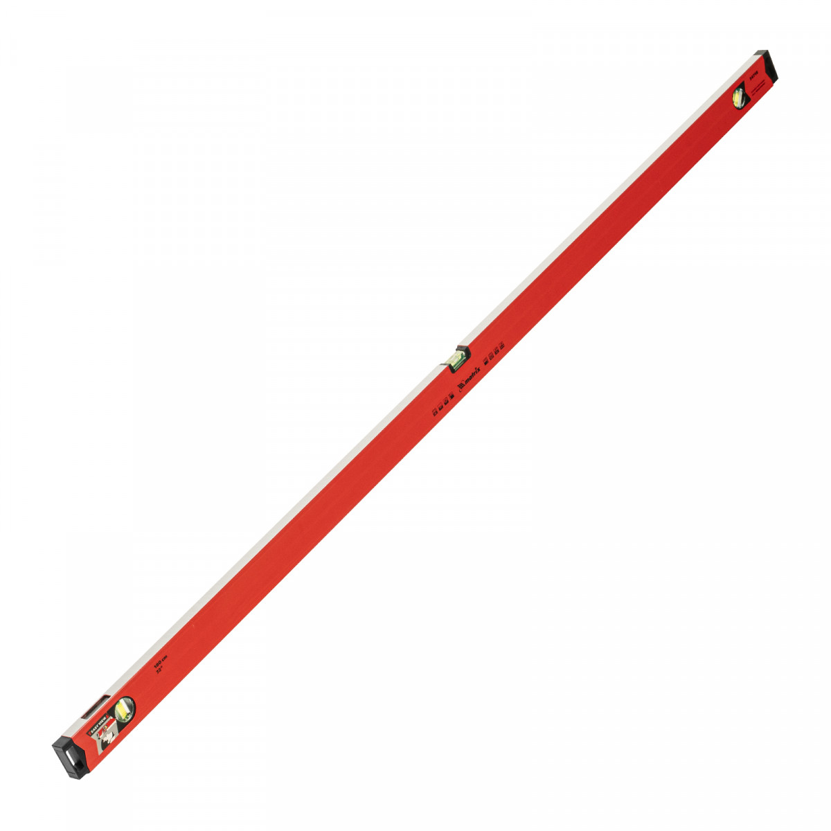 Уровень алюминиевый магнитный Matrix 34718 усиленной конструкции, длиной 1800 мм, с фрезерованной рабочей поверхностью, оснащен 3 глазками и одним зеркальным отражателем. Позволяет выявить отклонения от вертикали, горизонтали и угла 45°. Встроенный зеркальный глазок облегчает считывание показаний.
