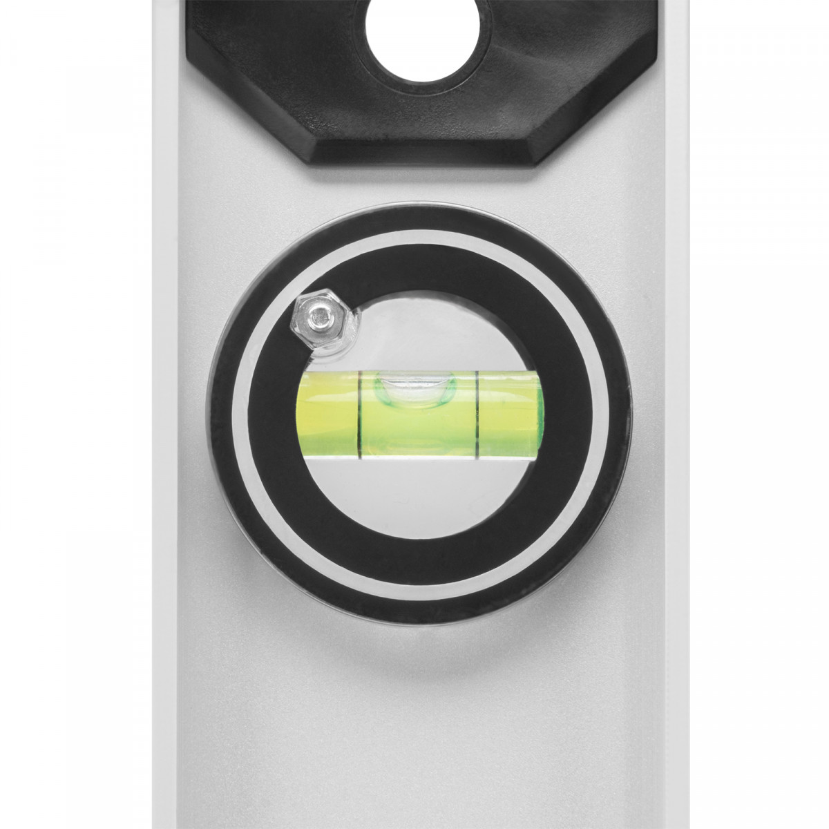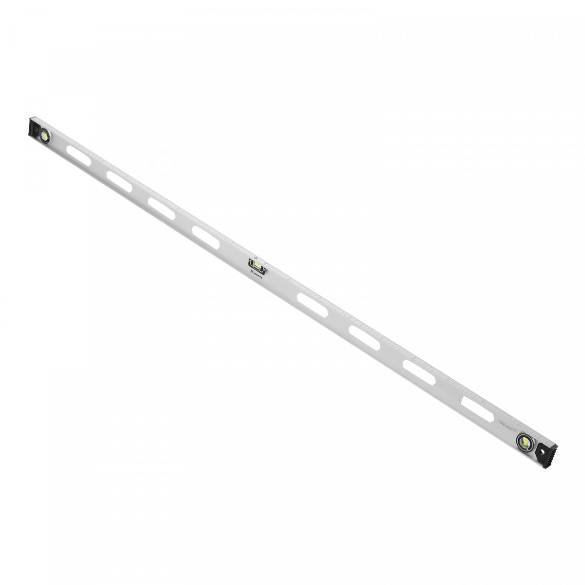 Алюминиевый уровень Matrix «Рельс» 34038 длиной 1800 мм имеет 3 глазка: 2 для проверки отклонений от заданной вертикали и горизонтали и 1 поворотный для проверки наклонных поверхностей.