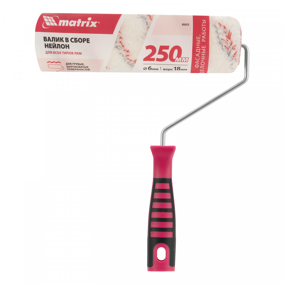 Валик Matrix 80653 «Нейлон Люкс» 250 мм с полиамидным ворсом длиной 18 мм, двухкомпонентной ручкой диаметром 6 мм, диаметром ролика 48 мм, предназначен для нанесения любых типов лакокрасочных материалов на грубые неровные поверхности. Ширина 250 мм позволяет эффективно и быстро окрашивать большие площади: стены, потолки, фасады и т.д. За счет длины 18 мм ворс прокрашивает самые труднодоступные места, обеспечивая высокое качество окраса.