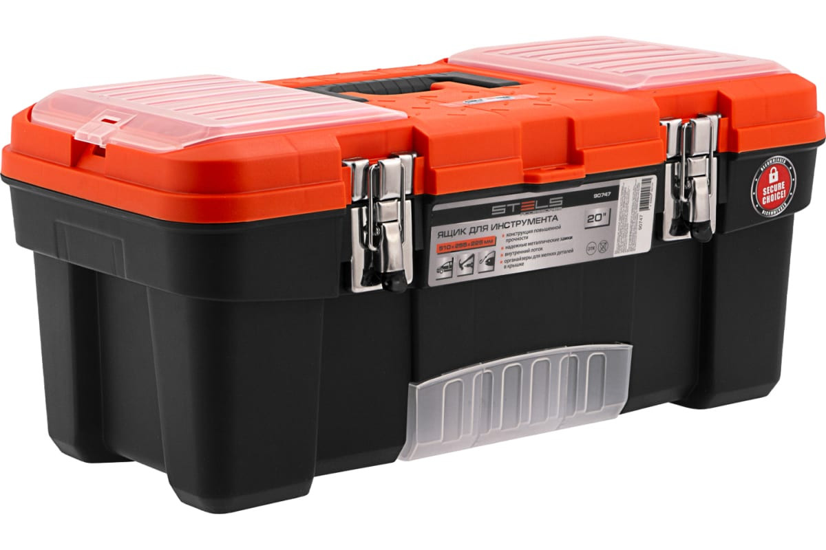 Ящик для инструмента с металлическими замками STELS 20", 510x255x225 мм 90747 — альтернатива коробке для инструментов. В нем можно расположить ручной инструмент, крепежи, хозяйственные мелочи, а также рыболовные снасти.В крышке имеются встроенные органайзеры, на дне - выкидной лоток с отсеками для мелких деталей, что увеличивает функциональность ящика. Его удобно брать в поездки, также ящик пригодится дома, на даче или в гараже.