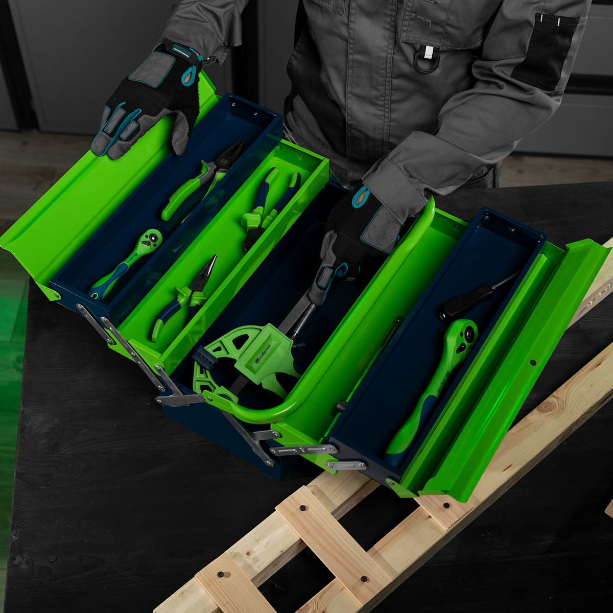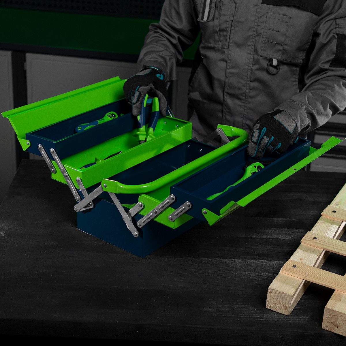 - Удобное использование — ящик легко раскладывается, ручка поворачивается и не мешает размещать или извлекать инструменты.