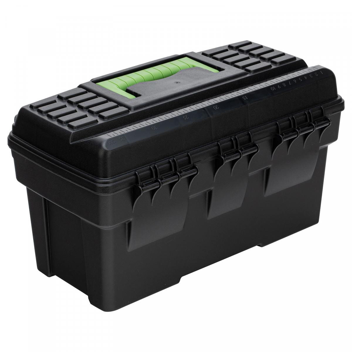 Ящик для инструмента Сибртех 90805 из пластика, размером 430 х 235 х 250 мм (длина 18"), — удобное вместилище для инструментов, бытовых мелочей, рыболовных снастей. На крышку нанесена измерительная шкала в сантиметрах и дюймах, поэтому можно проводить измерения, даже если под рукой нет линейки. Ящик пригодится в поездке, на рыбалке, а также дома, на даче или в гараже.