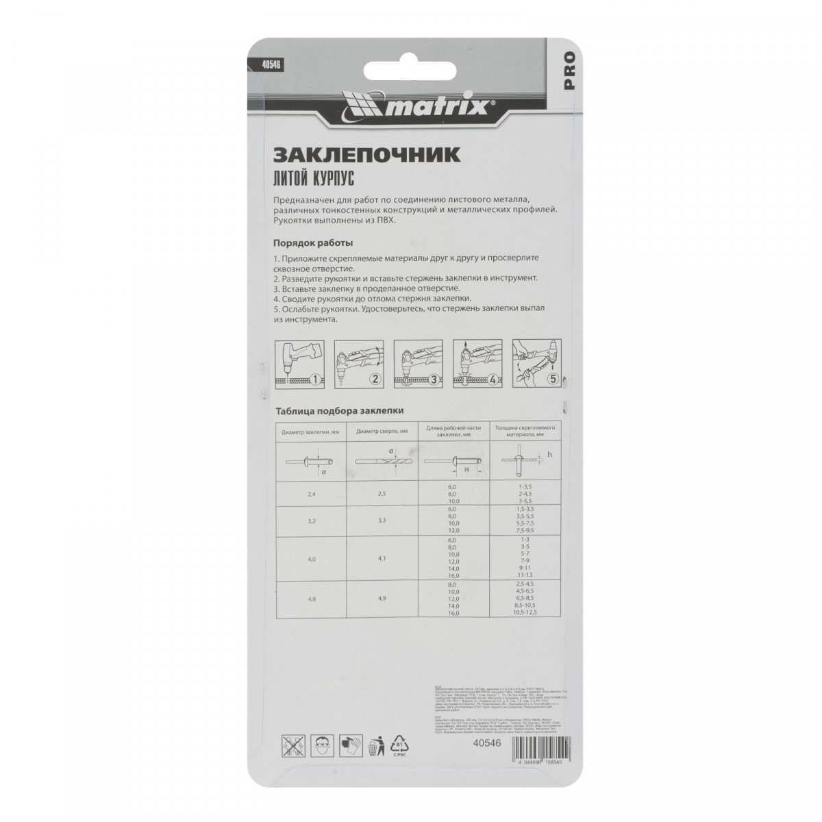 Заклепочник литой, 200 мм, заклепки 2.4-3.2-4.0-4.8 мм, Pro Matrix