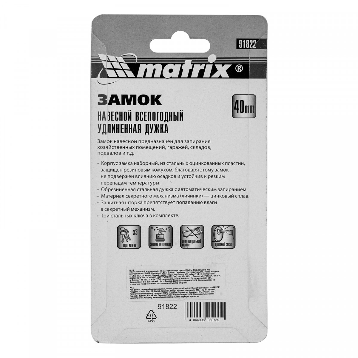 Навесной всепогодный замок Matrix 91822 шириной 40 мм, с удлиненной дужкой, вешается на дверь и обеспечивает сохранность имущества. Поможет защитить от несанкционированного проникновения сарай, гараж, подвал и другие помещения, подходит для высоких запорных петель.