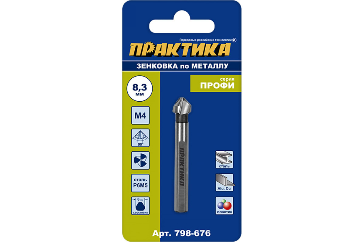 Зенковка по металлу 8.3x50 мм, 90 град., под резьбу М4 ПРАКТИКА 798-676 предназначена для снятия фаски по краю отверстия или формирования конического углубления под потайные головки крепежных элементов в стали с пределом прочности до 900 Н/мм2, сером чугуне, цветных металлах и твердом пластике. Изготовлена из быстрорежущей стали Р6М5 с поверхностным упрочнением режущей кромки.