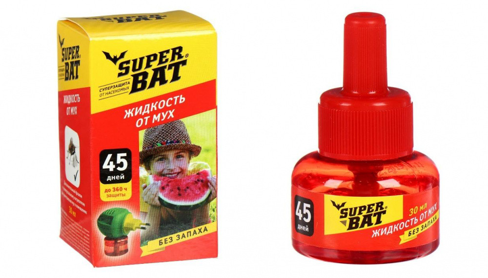 Дополнительный флакон к электрофумигатору для уничтожения мух в помещениях.При использовании универсального электрического фумигатора «SuperBat», достаньте из коробки флакон с жидкостью от мух «SuperBat», отверните защитный колпачок. Вставьте флакон в электрический фумигатор «SuperBat» и плотно прикрутите. Включите прибор в электросеть, поверните вилку прибора так, чтобы флакон располагался вертикально. При использовании противомоскитной пластины вынуть ее из упаковки и вложить в электрический фумигатор «SuperBat». Вилку повернуть согласно розетке и включить прибор в электросеть на 220 Вольт.Средство начинает действовать через 10-15 минут после включения. Уничтожение мух достигается за 1-2 часа. При открытых на ночь окнах и форточках электрический фумигатор «SuperBat» с флаконом или пластиной оставьте включенным на всю ночь для уничтожения залетающих мух.Запрещается одновременное применение флакона с жидкостью и пластины.